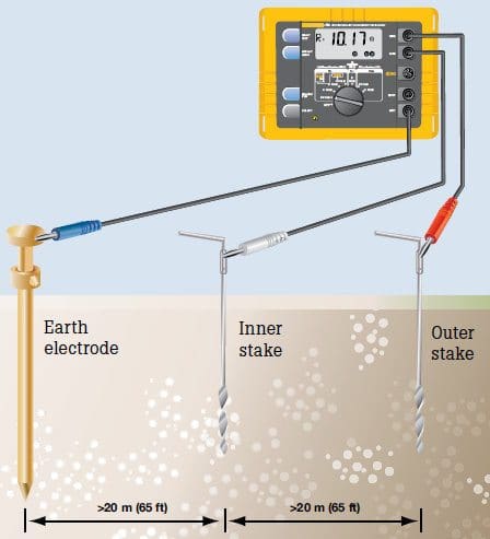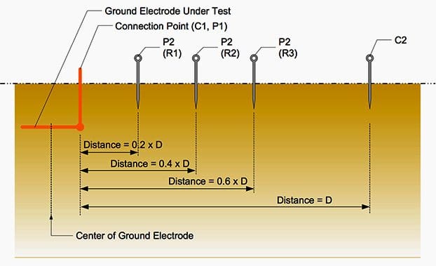 3. الکترود جریان (C): میخ تست کمکی دیگر که در فاصله‌ای دورتر از الکترود ولتاژ قرار می‌گیرد.