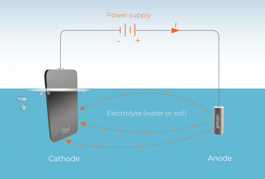 در این تکنیک، هدف انتقال الکترونهای اضافی به فلز سازه است. با افزایش تعداد الکترونها، سرعت واکنش کاتدی بالا رفته و در مقابل، واکنش آند کند میشود. این الکترونها میتوانند از طریق منبع جریان مستقیم یا فلزات فعال تأمین شوند. در صورت قدرتمند بودن منبع، اختلاف پتانسیل بین آند و کاتد از بین میرود و خوردگی فلز متوقف میشود. میزان خوردگی فلزاتی مانند آهن، رابطهی مستقیم با اختلاف پتانسیل بین کاتد و آند دارد. بنابراین، کاهش قابل توجه این اختلاف پتانسیل، منجر به کاهش سرعت خوردگی یا توقف کامل آن میگردد.